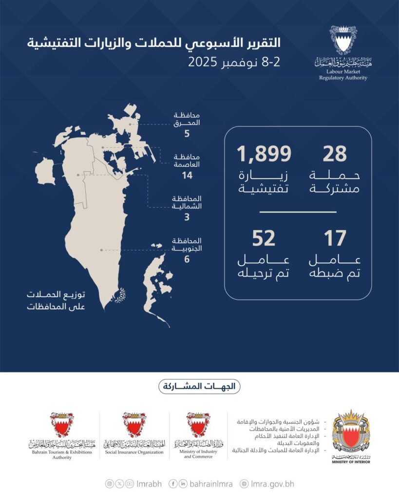 وأكدت الهيئة استمرار التنسيق المشترك مع الجهات الحكومية لتكثيف الحملات التفتيشية في جميع محافظات مملكة البحرين، والتصدي لأي مخالفات أو ممارسات تؤثر سلبًا على سوق العمل واستقراره وتنافسيته، أو تضر بالأمن الاقتصادي والاجتماعي في المملكة.
