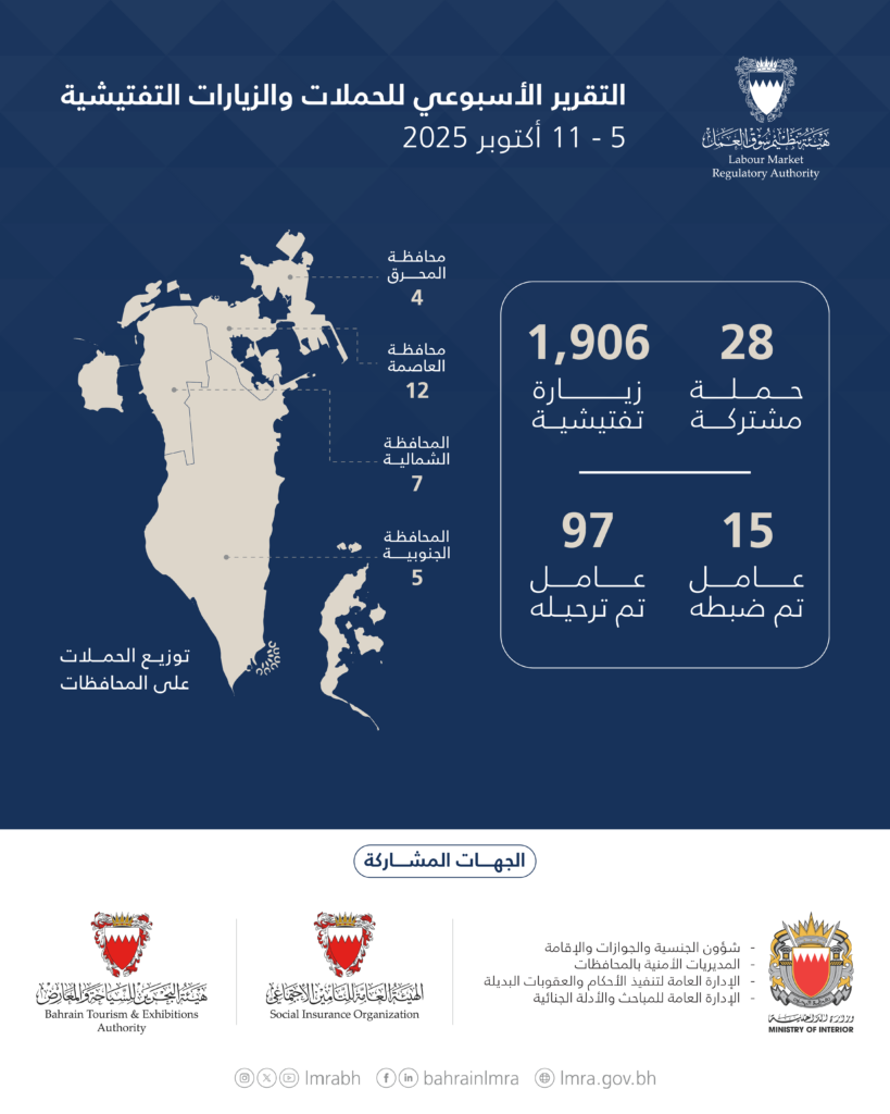 نفذت هيئة تنظيم سوق العمل 1,934 حملة وزيارة تفتيشية، خلال الفترة الممتدة من 5 إلى 11 أكتوبر 2025، والتي أسفرت عن ضبط 15 عاملًا مخالفًا وغير نظامي، فيما بلغ عدد المرحلين خلال الفترة المذكورة 97 مخالفًا.