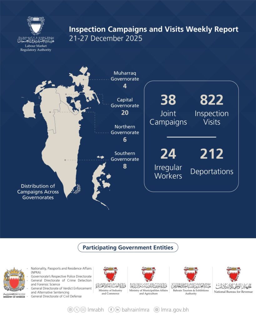 The Labour Market Regulatory Authority (LMRA) announced the implementation of 860 inspection campaigns and visits, during the period of 21 to 27 December 2025, which resulted in the detention of 24 violating and irregular workers, while 212 violators were deported.
