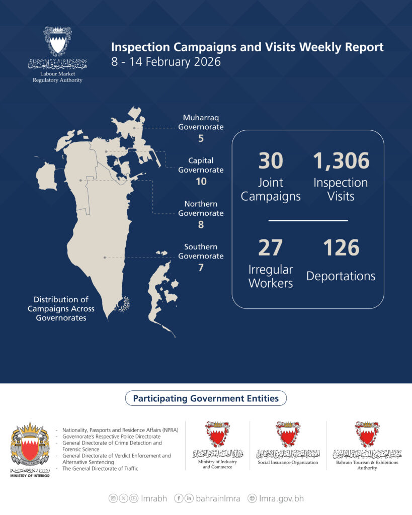 The Labour Market Regulatory Authority (LMRA) announced the implementation of 1,336 inspection campaigns and visits, during the period of 8 to 14 February 2026, which resulted in the detention of 27 violating and irregular workers, while 126 violators were deported.