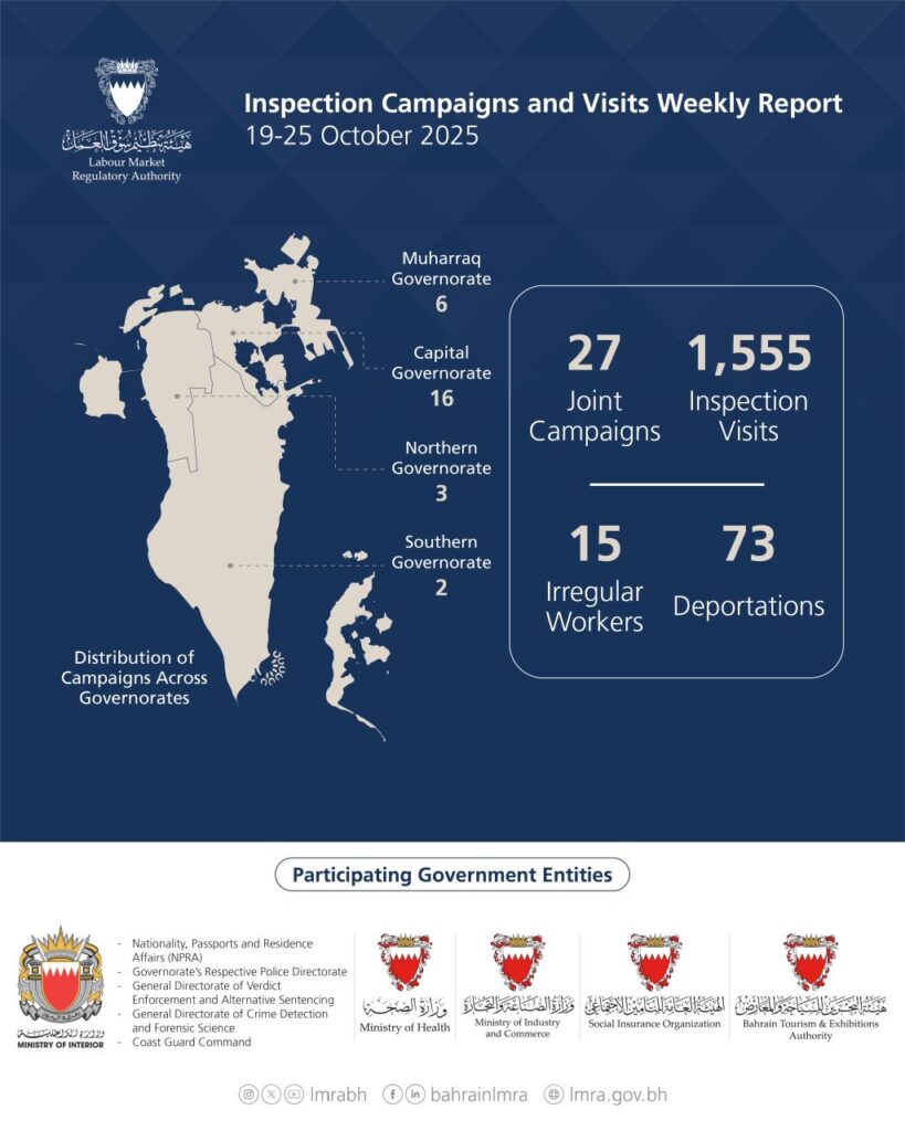 The Labour Market Regulatory Authority (LMRA) announced the implementation of 1,582 inspection campaigns and visits, during the period of 19 to 25 October 2025, which resulted in the detention of 15 violating and irregular workers, while 73 violators were deported.