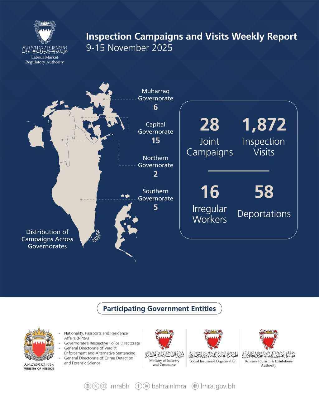 The Labour Market Regulatory Authority (LMRA) announced the implementation of 1,900 inspection campaigns and visits, during the period of 9 to 15 November 2025, which resulted in the detention of 16 violating and irregular workers, while 58 violators were deported.