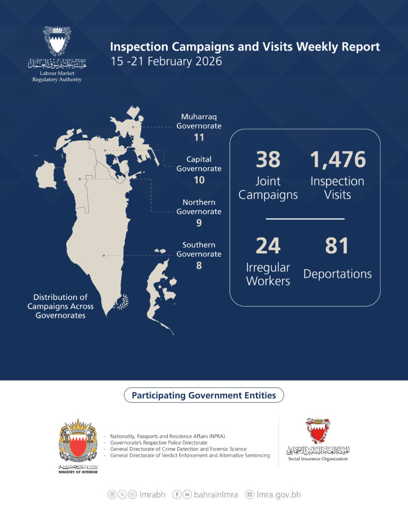 The Labour Market Regulatory Authority (LMRA) announced the implementation of 1,514 inspection campaigns and visits, during the period of 15 to 21 February 2026, which resulted in the detention of 24 violating and irregular workers, while 81 violators were deported.
